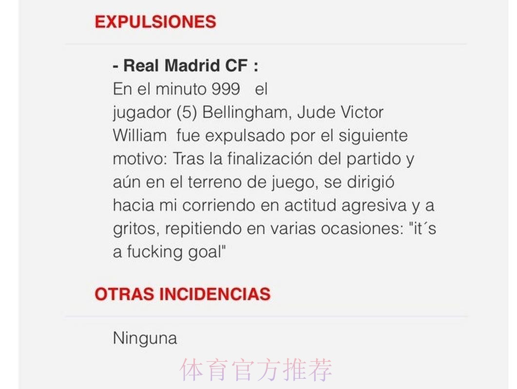 离谱!裁判报告-贝林第999分钟被罚下 还大爆粗口